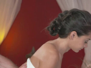 Масер свршава на бринету леђа. Прелепа европска бринета пуши дебели курац свом масеру након масаже, а затим јој удара обријану пичку и свршава на леђа