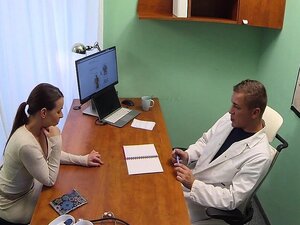 Доктор јебе бринету у канцеларији у лажној болници. Европски доктор прегледа секси бринету пацијенткињу у канцеларији у лажној болници и након што јој је дао рецепт, јебе је у разним позама